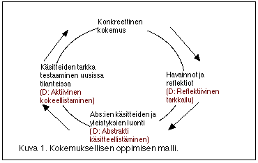 Välitön, konkreettinen kokemus on perustana havainnoinnille (observation) ja heijastumana syntyvälle järkeilylle (reflection). Havaintojen perusteella rakennetaan idea, yleistys tai "teoria", josta voivat seuraata uudet toiminnat. Nämä ilmentymismuodot tai hypoteesit palvelevat sitten suuntalinjoina uusille kokemuksille.