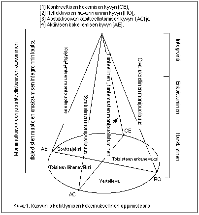 Näiden kolmen vaiheen kautta syntyy kasvavan monimutkaisuus ja suhteellinen tapa käsitellä maailmaa ja omia kokemuksia. Kuvassa 5 esitetään kasvun ja kehityksen kokemuksellisen oppimisen malli. s. 249, Kuva s. 250