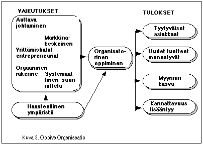 Kuva 3 näyttää käsityksemme oppivan organisaation arkkitehtuurista. On tärkeä huomata, että oppiva organisaation on esittelemiemme johtamiseen kuuluvien toimien synergioiden tuote. Ilman niitä orgaaninen rakenne on tuhoon tuomittu tai ainakin tehoton. Kuva sivu 22